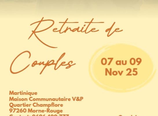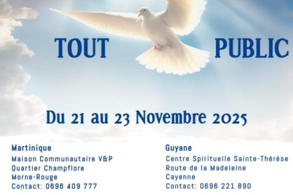 Vie et Partage vous propose une retraite des COMBATTANTS UNIQUEMENT POUR LES MEMBRES DE GROUPES DE COMBAT Du vendredi 06 au dimanche 08 Décembre 2024 En Martinique : « Maison Communautaire Vie et Partage » Quartier Champflore 97260 Le Morne-Rouge Contact : 0696 40 49 77 Hébergement en chambre...
