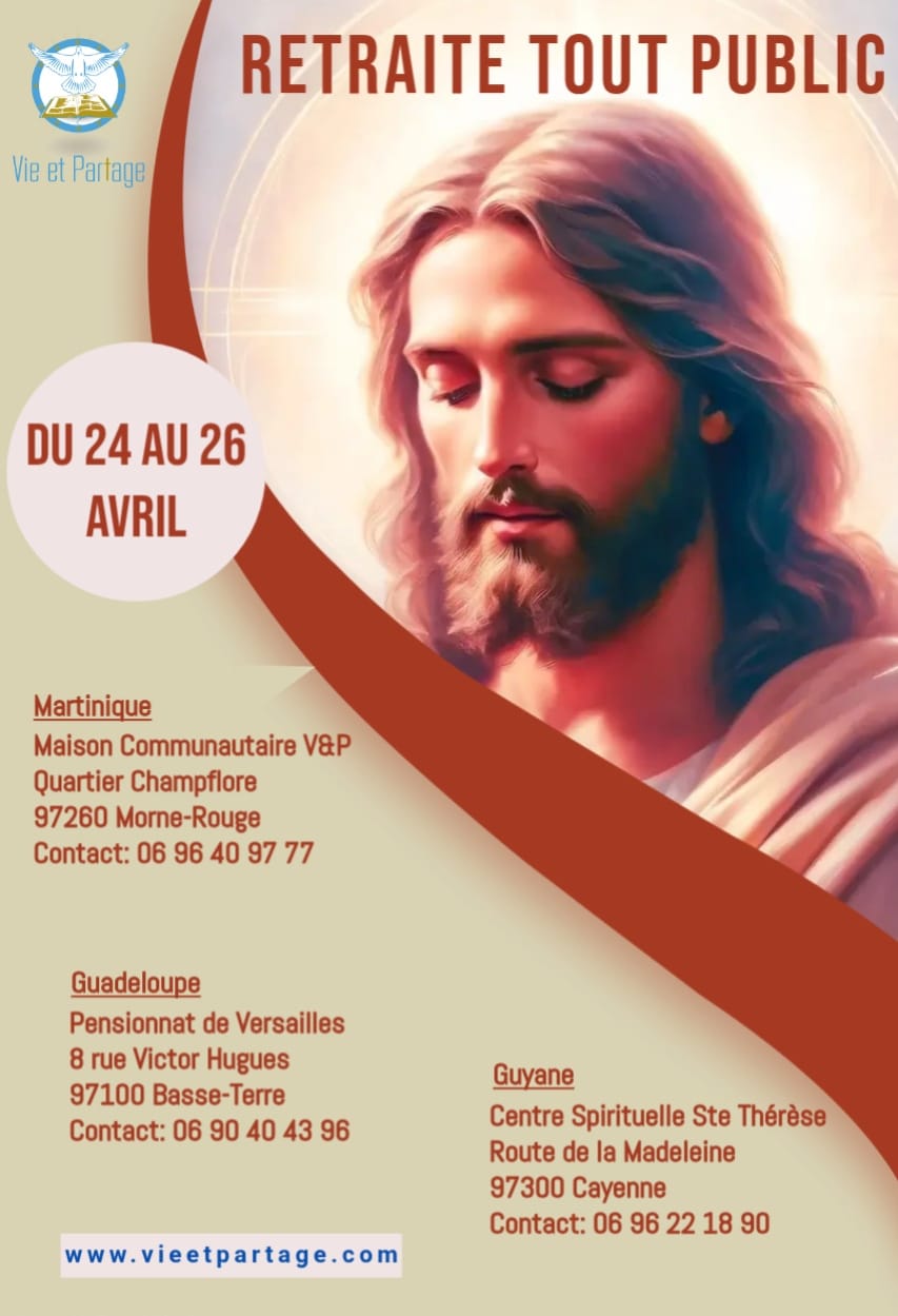 Mar2026 Partage de la Parole DOM [Jusqu’à Pâques] [Hexagone] Lundi | 19 Janvier 2026 [Caraibes/Guyane] Lundi | 19 Janvier 2026[Hexagone] Lundi 19/01 à 23h59[Caraïbes] Lundi 19/01 à 18h59[Guyane] Lundi 19/01 à 19h59 RETRAITE TOUT PUBLIC_Paray-le-Monial 26 [Hexagone] Vendredi | 27 Mars 2026 [Caraibes/Guyane] Vendredi | 27 Mars 2026[Hexagone] Vendredi 27/03 à 17h30[Caraïbes] Vendredi 27/03 à 12h30[Guyane] Vendredi 27/03 à 13h30 Maison du Sacré-Cœur 3 ter rue de la Paix, 71600 Paray-Le-Monial. 06 65 15 03 65 Avr2026 Retraite Tout-Public Avril 2026 – DOM [Hexagone] Vendredi | 24 Avril 2026 [Caraibes/Guyane] Vendredi | 24 Avril 2026[Hexagone] Vendredi 24/04 à 23h00[Caraïbes] Vendredi 24/04 à 17h00[Guyane] Vendredi 24/04 à 18h00 +596 696 40 97 77 Mai2026 PÈLERINAGE À MEDJUGORGE – MAI 2026 [Hexagone] Vendredi | 15 Mai 2026 [Caraibes/Guyane] Vendredi | 15 Mai 2026[Hexagone] Vendredi 15/05 à 14h00[Caraïbes] Vendredi 15/05 à 08h00[Guyane] Vendredi 15/05 à 09h00 +596 696 40 97 77 ; +596 696 04 63 91 Juin2026 Retraite Tout-Public Juin 2026 – DOM [Hexagone] Vendredi | 12 Juin 2026 [Caraibes/Guyane] Vendredi | 12 Juin 2026[Hexagone] Vendredi 12/06 à 23h00[Caraïbes] Vendredi 12/06 à 17h00[Guyane] Vendredi 12/06 à 18h00